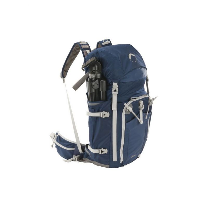 The galaxy blue with gray trim Rover Pro 45L AW Backpack from Lowepro is a serious pack for the outdoor enthusiast. With its multitude of capabilities and capacity, this pack can more than get you through a day in the field or an overnight hike or climb. Its gear capacity is considerable. The Rover will hold your pro DSLR with grip and attached 24-70mm f/2.8, 3-4 extra lenses or flash plus a tripod or monopod. It can also store up to a 15" laptop. It even has room for your sleeping pad, small tent, ice axe or trekking poles plus additional personal items.
